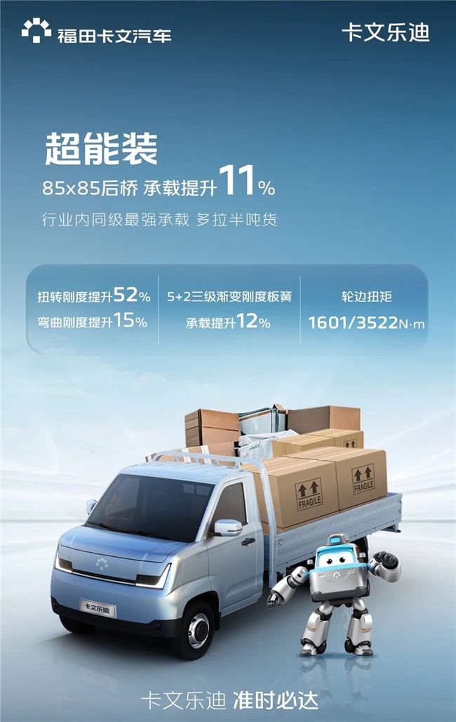 从动画荧幕驶入现实物流,超级飞侠乐迪“准时送达”的承诺,在福田卡文乐迪身上找到了坚实的现实依托。它以“航空级效率”为内核,融合澎湃高效动力、强大承载空间与全面安全科技三大核心优势,重新定义了高效小卡的价值标杆。