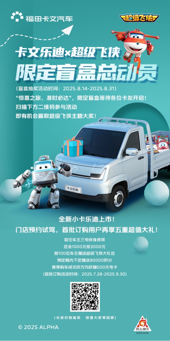 即日起至 2025年8月31日,扫描下方海报二维码,参与 “卡文乐迪 X 超级飞侠 — 限定盲盒总动员”H5抽奖活动!分享好友助力拆盲盒,赢取超级飞侠联名惊喜好礼!首批车主更尊享五重专属礼遇。让福田卡文乐迪的“航空级效率”伴您启程!每一公里征途,都是“使命必达”的最佳证明,让每一公里更美好!