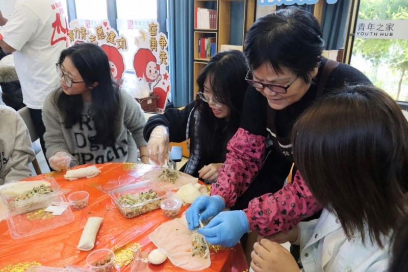 分享结束后,现场的桌椅被重新拼搭成数张大操作台,同学们围聚在桌旁亲手包春卷、品尝地道莆仙美食,指尖的触感与舌尖的美味交织在一起,让大家在沉浸式体验中实实在在触摸到了本土非遗的独特魅力。